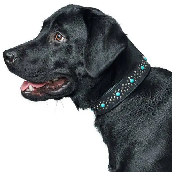 La décoration sous forme de rivets et de pierres précieuses donne au collier un aspect très intéressant et unique.