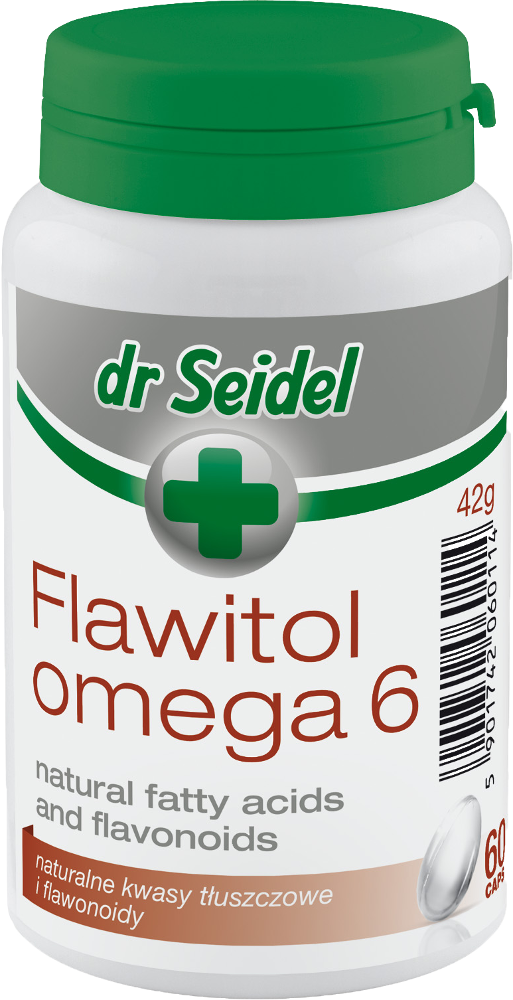 Flawitol Omega 6 est une préparation nutritionnelle qui enrichit le régime alimentaire en acides gras essentiels (AGE). La présence d’AGE dans l’alimentation détermine la croissance et le développement corrects de l’organisme. Les AGE ne sont pas synthétisés dans l’organisme des animaux et des humains, il est donc extrêmement important de les compléter sous forme de compléments alimentaires. Flawitol Omega 6 est en outre enrichi de flavonoïdes qui augmentent la disponibilité des AGE. Il se présente sous la forme de capsules pratiques à utiliser, ce qui garantit la durabilité de la préparation. Flawitol Omega 6 contribue au maintien d’un pelage et d’une structure cutanée sains et beaux. Flawitol Omega 6 contribue également à l’immunité de l’organisme et stimule les mécanismes naturels de protection contre les processus inflammatoires. Les huiles d’onagre et de bourrache contenues dans les capsules renforcent les cellules nerveuses, les muscles, les systèmes circulatoire et excréteur. En outre, les flavonoïdes présents dans la préparation ont un effet anticancéreux.