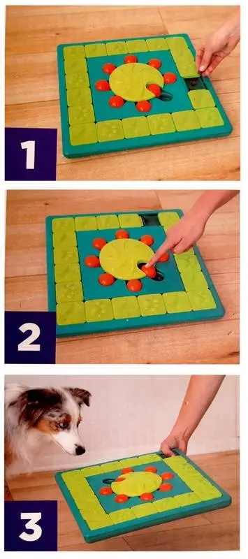 En reniflant et en aidant avec sa patte ou son museau, votre chien trouvera des compartiments à déverrouiller avant d’atteindre les friandises cachées à l’intérieur. Le système de verrouillage consiste à déplacer les plaques mobiles situées sur les bords du jouet. En outre, il y a un bouton rotatif au milieu avec un évidement qui s’insère dans les pièces rondes cachant également les friandises. Vérifiez si votre animal est un génie au-dessus des génies !